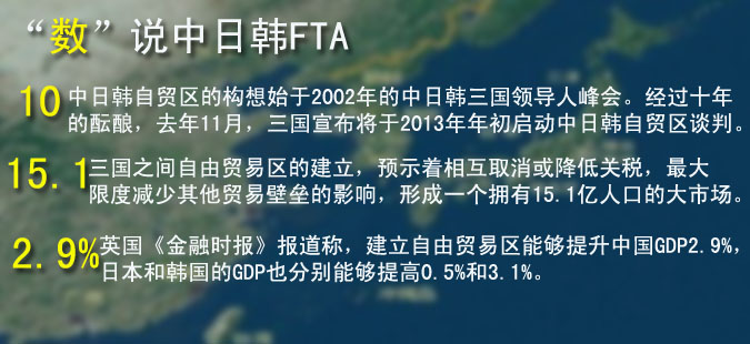 中日韓三國3月26日在韓國首爾舉行簽署自由貿易協定(FTA)的首輪談判,邁出了開展經濟合作的第一步,這意味著FTA談判終于進入正式協商階段。三方約定今年將舉行三輪談判,第一輪在韓國,后兩輪分別在中國和日本舉行。