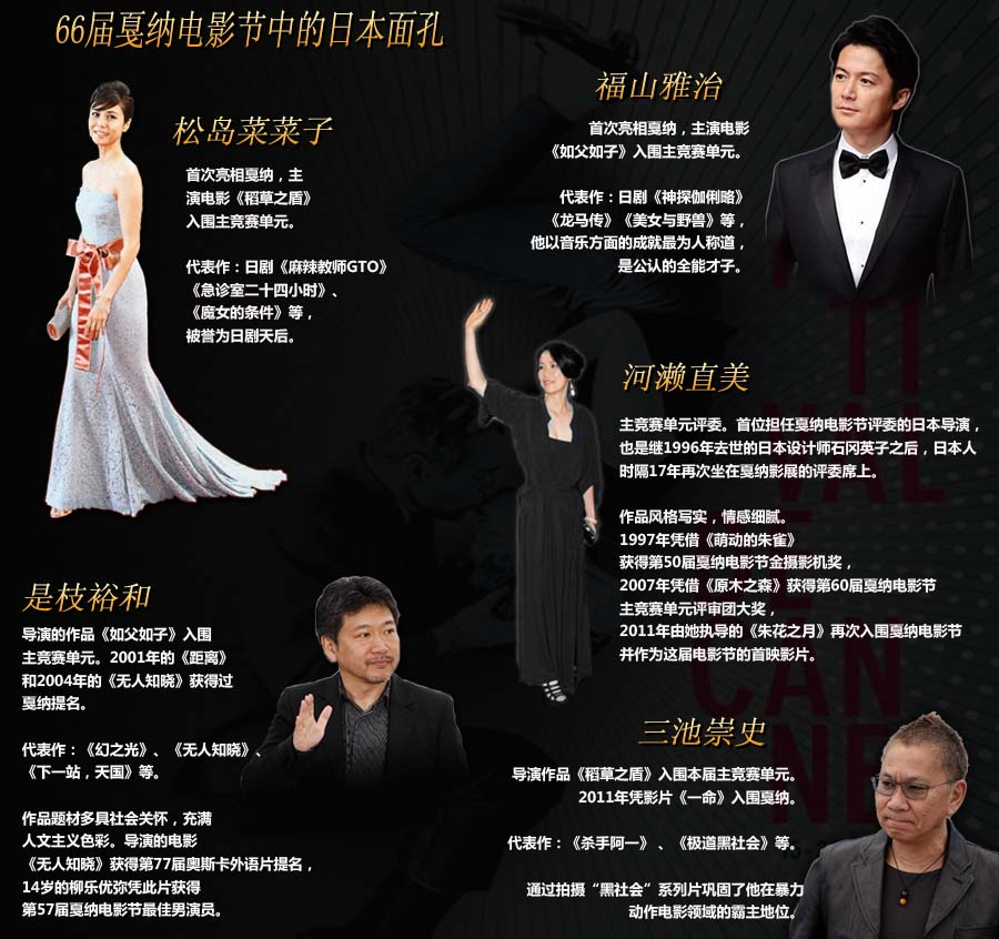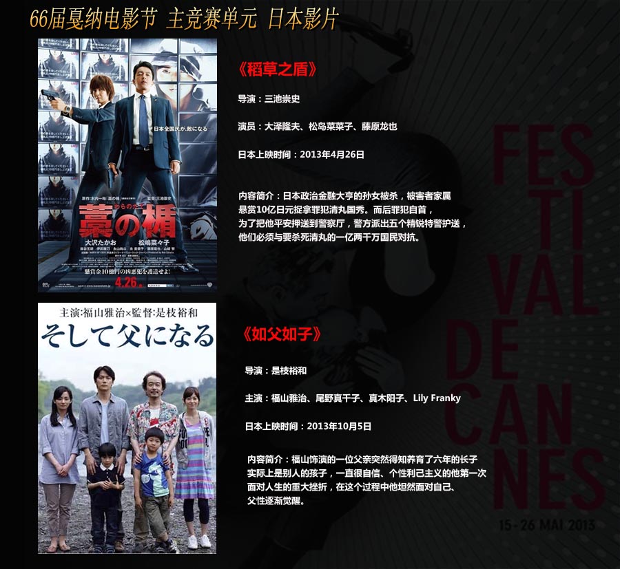 第66屆戛納國際電影節于當地時間2013年5月15日至26日在法國戛納舉行,由是枝裕和導演的《如父如子》和三池崇史導演的《稻草之盾》兩部日本影片雙雙入圍主競賽單元。河瀨直美也作為首位擔任戛納評委的日本導演出席了電影節。本屆電影節共有1858部影片報名,近80部影片將在兩周內展映,20部影片入圍主競賽單元。最終法國影片《阿黛爾的人生》摘取電影節最高獎項“金棕櫚獎”;日本影片《如父如子》獲評委會特別獎。日本媒體稱,不光是歐美系,日本影片在本屆電影節中也有了存在感...