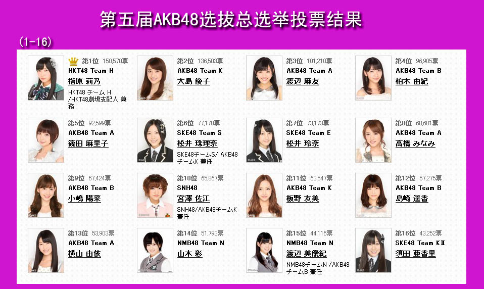 第五屆AKB48總選舉投票結果今晚在橫濱日產體育場揭曉,最終指原莉乃獲得最高票數150570票,其次為大島優子136503票、渡邊麻友101210票。