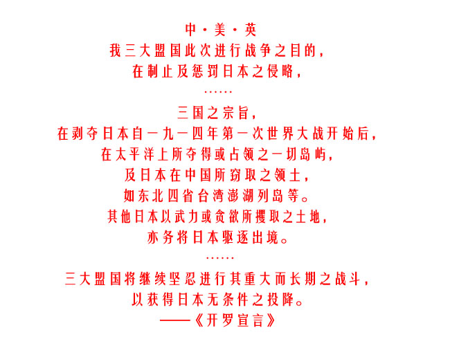 1943年12月1日,中美英三國首腦蔣介石、羅斯福、丘吉爾于開羅發表宣言,宣示協同對日作戰,承諾處置日本侵略者。這一年,世界反法西斯戰爭勝利曙光初露。這就是著名的《開羅宣言》。