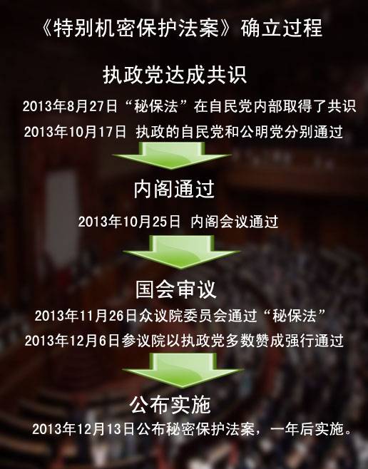 “隨著國際形勢的復雜化,與國民安全相關的信息重要性提高”,“為了防止特別秘密的泄漏,保障國民安全”,有必要確立相關的體制。---特別秘密保護法案總則
