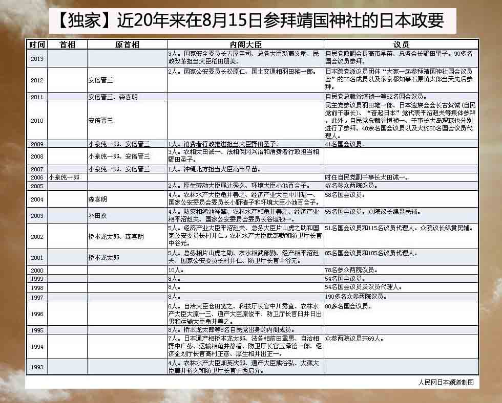 在1993年到2013年的這20余年中,作為現任首相在8月15日參拜靖國神社的只有小泉純一郎,時間是2006年。當年9月小泉卸任首相職務之后,還曾在2007年至2009年連續三年堅持赴靖國神社參拜。除此之外,作為原首相前往參拜的還有安倍晉三、森喜朗、橋本龍太郎和羽田孜。這當中,最執著的當屬安倍。他在自己的第一任期(2006-2007年)結束之后,自2008年開始每年的這一天必去,已經連續去了5年。森喜朗去過3次,橋本龍太郎去過2次,羽田孜去過1次。就內閣大臣而言,在2000年之前,幾乎每年都會有7、8名內閣大臣在“8.15”當天前往參拜,多的時候甚至達到10人。而在2000年之后,每年僅有4、5名內閣大臣參拜靖國神社,少的時候僅有1人。即便是安倍晉三在2012年底再次執掌內閣以后,內閣成員前往參拜靖國神社的人數與前幾年相比也沒有太大變化。
