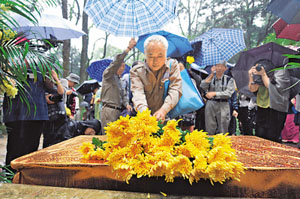 9月3日,6名已經超過90歲的南僑機工和一些海內外人士來到云南昆明西山森林公園的南洋華僑機工抗日紀念碑前,舉行紀念活動。圖為一位老人在紀念碑前為逝去的南僑機工獻花。