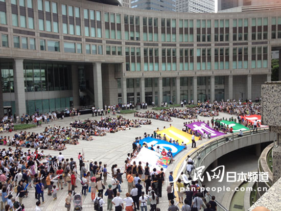 集會民眾在東京都廳前擺出“thank you”的字樣