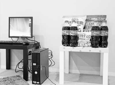 為了幫助房客們控制體重,房主特意把公用的客廳、餐廳、健身房等的墻壁都重新換上了青色壁紙,因為據說這種顏色有利于抑制食欲。為了增強入住者們的“克制力”,房主還在公用客廳擺上各種免費的零食、飲料(如圖3),雖然可以隨便吃,但這并不是“福利”,而是專門用來鍛煉大家抵抗美食誘惑能力的。要是誰意志薄弱吃了這些東西,將來可能會反映在房租上,這也算是房東的“狠招”吧。