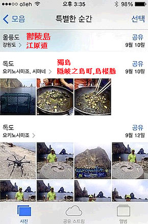 據韓國《慶北日報》報道,慶尚北道郁陵郡一名14歲的少年,20日將iPhone更新到iOS 7后發現,他在郁陵島拍的照片不在慶尚北道,而是標記江原道,接著檢查今年初參觀獨島的照片,竟標示在“島根縣隠岐之島町”。