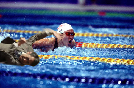 大和田常務在競泳比賽中和專業選手爭分奪秒時候的照片