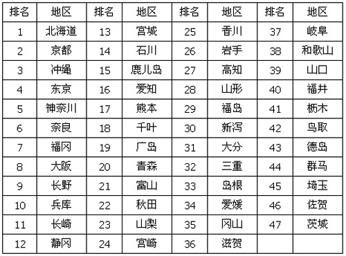 日本民間咨詢公司“品牌綜合研究所”近日公布了2013年度日本全國各地區的魅力度排名,據顯示,47都道府縣中排名第一的是北海道,2012年倒數第二位的茨城縣則降至最后一位。