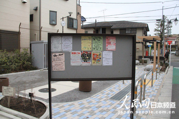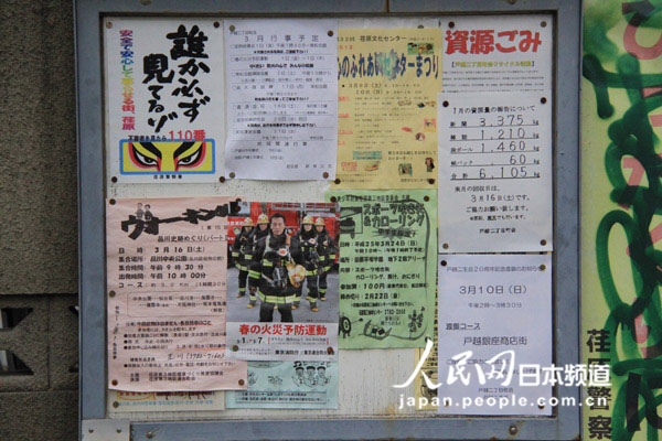 廣告板上貼著社區資源回收、消防活動通知,以及安全提示等內容。