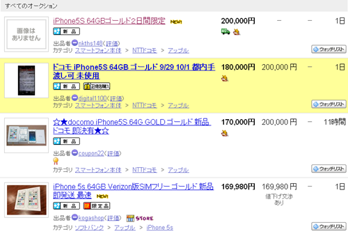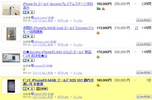 因此在雅虎拍賣上,5S金色更是一展土豪本色,拍賣價一直飆升。到了9月26日8時,雅虎拍賣上雖然推出了50臺以上的5S金色,很多人都出價15萬日元以上,也已經有人開價20萬日元,這個價格是市面上的2倍之多。但是不少商品的一口價都設定在20萬日元以上,截止到9月29日10時,最高的是25萬日元。iPhone5S在日本的普通售價在8-9萬日元左右(約合人民幣4980元-5604元)。