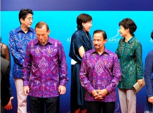 據日本《朝日新聞》10月8日報道,7日,參加亞太經濟合作組織(APEC)會議的各國領導人進行紀念留影時,日本首相安倍晉三的夫人安倍昭惠與韓國總統樸槿惠握手并交談。