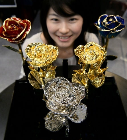現場還展示了一種特別的玫瑰,這種玫瑰的花瓣表面上鍍上了一層或金質或白金的覆蓋物,以此來延長玫瑰花的保存期。