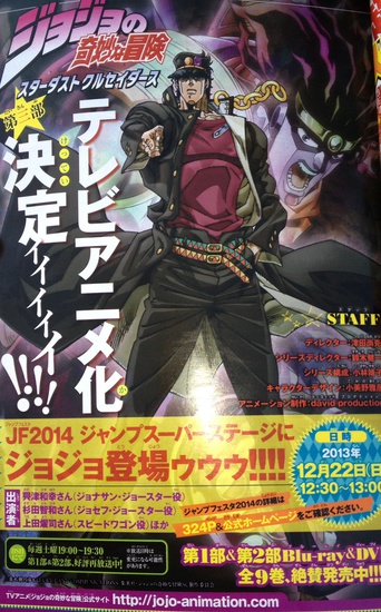 日本漫畫家荒木飛呂彥的漫畫《JoJo的奇妙冒險》第三部(單行本第12到第18卷的內容)正式宣布動畫化。動畫播出時間尚未確定,但根據其內容推測動畫化至少要播上兩季度。