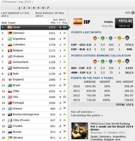 國際足聯(FIFA)17日公布了最新一期的男足國家隊排名,西班牙仍然位居世界第1,德國超阿根廷位列世界第2,哥倫比亞排名第4。
