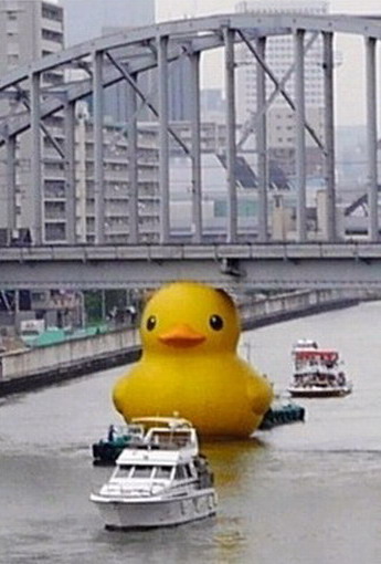 據悉,大黃鴨的暢游路線為從大阪北區中之島通過安治川到達大阪灣。但可能是由于它身形過于龐大,在經過JR鐵橋下時頭部一度蹭到了橋底。