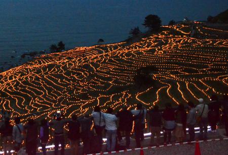 日本石川縣輪島市的國家指定名勝“白米千枚田”,19日舉行了“田埂萬燈”活動。約3萬根蠟燭點綴著田埂,令約4公頃的梯田呈現出一派夢幻光景。