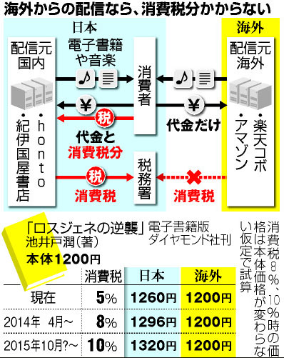 例如,購買稅前價格為1200日元的電子書的情形下,在國外著名電商網站亞馬遜上,花費1200日元即可購買到該圖書。但如果在日本國內的紀伊國書店,消費者就必須支付附加5%消費稅后的1260日元。由于消費稅的差異,使亞馬遜在市場競爭中處于有利地位。明年4月消費稅增加之后,價格差將會被進一步拉大。