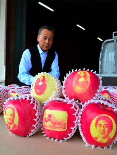 蘋果上的“安倍”和“奧朗德” 日本果農培育出“浮世繪”蘋果