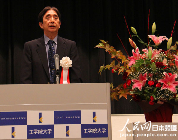 工學院大學校長水野明哲在工學院大學孔子學院成立五周年典禮上致辭。
