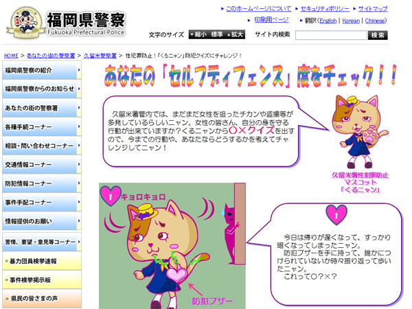 日本福岡縣久留米警署開設網頁,以知識問答的形式向女性介紹自我保護的相關知識。
