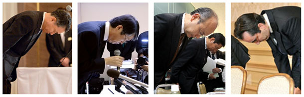各大企業負責人針對“食材造假”致歉(左起:阪急阪神酒店社長、近鐵旅館系統社長、三月伊勢丹常務執行董事、大阪麗思卡爾頓酒店總負責人)