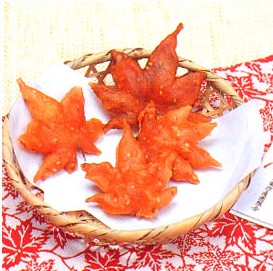 紅葉饅頭:一種紅葉形狀的小點心,是廣島縣宮島的特產。以面粉、雞蛋、糖、蜂蜜做成面胚包上豆沙餡,做成紅葉狀,燒制而成,也有栗子、抹茶陷等。