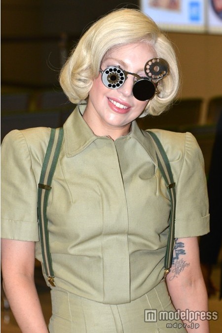 美國著名流行女歌手Lady Gaga 26日下午抵達日本成田機場。一身卡其色軍裝風搭配15厘米的黑色高跟鞋,一副表盤式太陽鏡,延續了一貫的奇特風格。