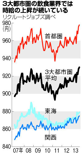 調查稱,日本首都圈連續6個月,關西地區連續24個月,東海地區連續17個月時薪高于上一年的同期水平。分析稱,其背景為日本經濟復蘇導致的勞動力不足。由于餐飲業工資水平較低,一旦出現勞動力不足的狀況,首先面臨的就是加薪。