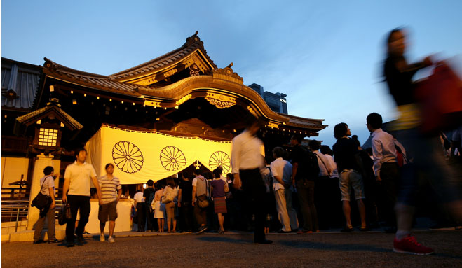 神社大殿里供奉著日本明治維新以來的246萬多軍人,其中包括日本歷次對外侵略戰爭中戰亡的軍人。1978年10月,東條英機等14名甲級戰犯和兩千余名乙級、丙級戰犯的牌位也被移進這個神社,作為“為國殉難者”祭祀。