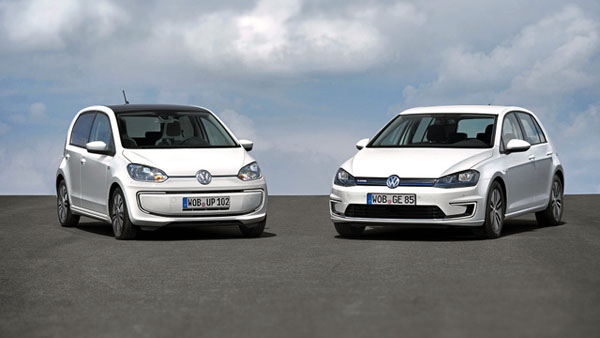 大眾推出的電動汽車E-UP(左)以及E-GOLF(右)(朝日新聞)