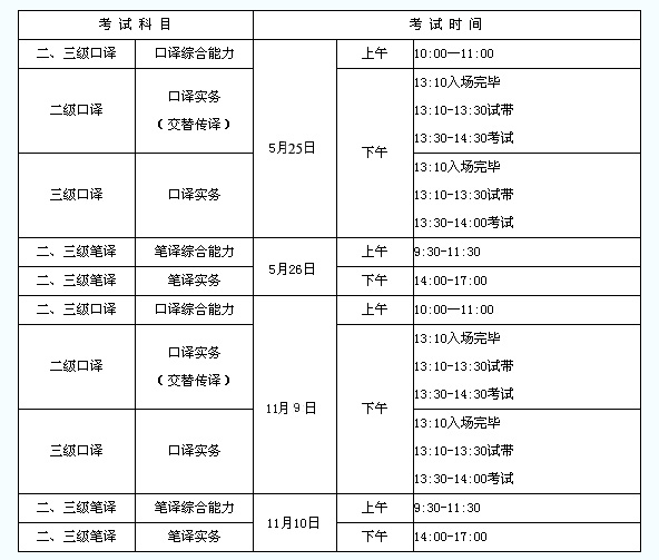 北京地區2013年度上半年翻譯專業資格(水平)考試已于2013年5月25-26日舉行。下半年考試將于11月9日和10日進行。官網于2013年2月16日公布了考試時間供廣大考生參考。具體安排如下表所示。