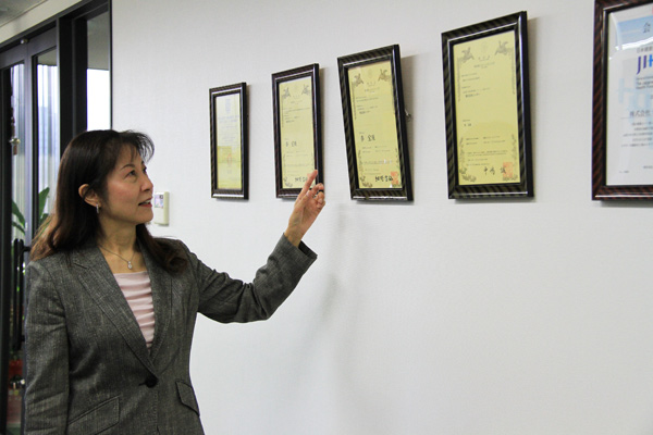 李寶珠向記者介紹公司產品專利和榮譽證書