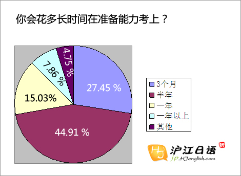 從上圖可以看出,愿意花一年甚至一年以上來準備日語能力考的考生占到了22.89%。愿意花半年的時間來準備考試的占到了44.91%。小編認為,在這一 群人當中,學生應該占了絕大的比重。因為在報考JLPT的考生中,大部分還是以學生為主,特別是大學生。不管從專業角度出發還是出于興趣,學習都會比較多 樣化,在備考的同時,還會通過練習日語口語等來提高實際能力,所以這些考生愿意花很多時間來備考。