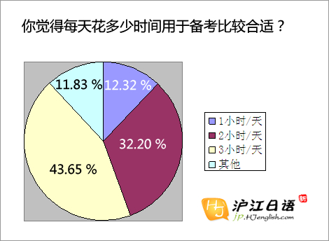 不難看出,每天花3個小時備考的人占到了43.65%,2個小時的占到了32.20%。這說明,有大部分的考生,愿意為了能力考,每天保持長時間的定時學 習。畢竟詞匯、語法、閱讀、聽力,每一方面照顧到,不是短時間就能完成的,這些應該還不包括看日劇、練口語等其他提高能力的時間。每天花1個小時備考的人 占到了12.32%,不是小數目。不過日語功底好,或者日語水平已經達到了考級的要求,每天1小時的學習時間可以保證能力的提高的話,那么,把時間多花在 其他像口語、翻譯等實際應用能力的提高上,也未嘗不可。