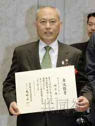 2月11日上午,東京都新知事舛添要一在東京都政府大樓從都選舉管理委員會處領取當選證書。(共同社)