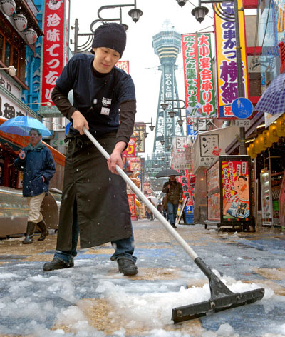 在大阪市內的一條商業街上,店員正在清理路上積雪。(朝日新聞圖片)