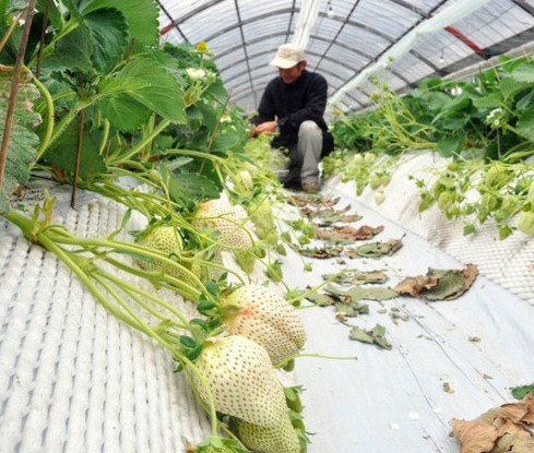 據悉,現在培育白色草莓的大棚已經開始正式生產。一進入大棚,一串串白色的草莓便映入眼簾。地面上也鋪著白色的塑料薄膜,防止白色草莓沾到泥土。