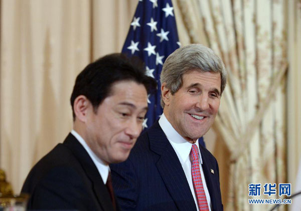 2月7日,在美國首都華盛頓,美國國務卿克里(右)和日本外相岸田文雄會晤后會見記者。