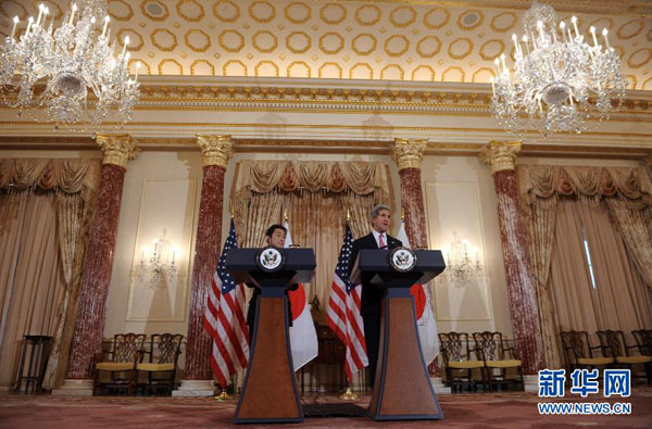 2月7日,在美國首都華盛頓,美國國務卿克里(右)和日本外相岸田文雄會晤后會見記者。