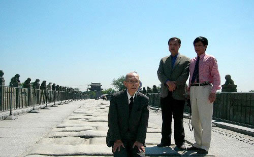2005年5月19日上午,91歲的日本侵華老兵本多立太郎來到盧溝橋跪下謝罪,他身旁站著時任中國人民抗日戰爭紀念館館長的王新華和作家方軍。