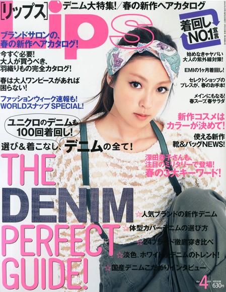 《Lips》4月刊的封面人物深田恭子,頭戴蝴蝶結發帶,身穿白色迷彩圖案針織衫,深綠色背帶褲,顯得十分成熟、時尚。