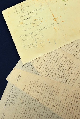 所展示的物品除了愛因斯坦在旅館內的便簽紙上用德語寫下的8張草稿外,還有他寄給在前往日本的船上結識并一直保持聯系的日本醫生三宅速的書信,以及愛因斯坦夫婦向三宅致以問候的彩色紙等。
