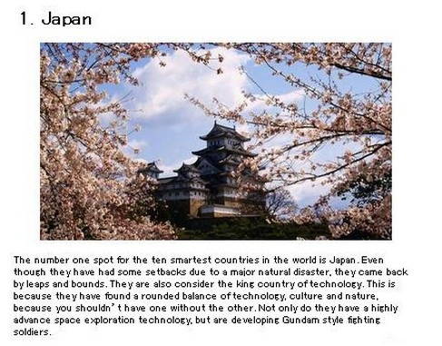 據日本gadget網站3月4日報道,omgtoplists.com網站發布了世界人民選出的“最聰明國家”前10位排名。同時,該網站還各式各樣的Top10排名,其中包括“世界上最魅力的國家”、“世界上最危險的運動”等。