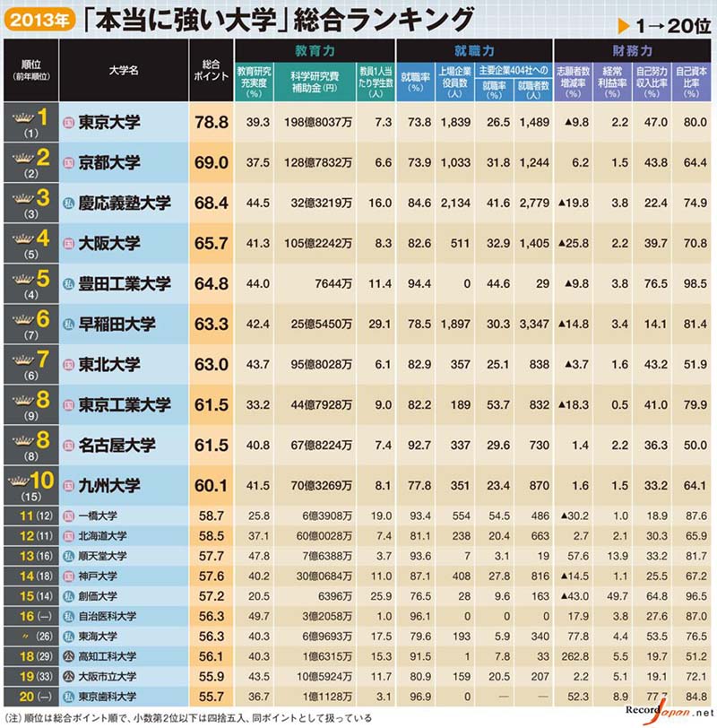 日媒13日報道,日本東洋經濟近日公布了2013年度日本國內最強大學排名TOP300,據顯示,日本東京大學連續8年蟬聯第一。