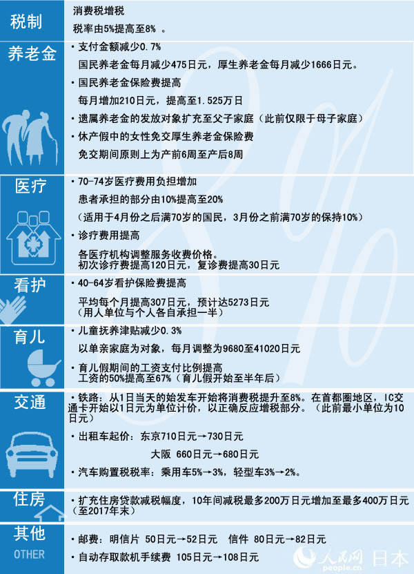 隨著4月1日日本新財政年度的即將到來,很多與生活息息相關的制度將會出現變化。其中,在購物時,或者在享受服務時的消費稅率將由現在的5%提高至8%。這是自1997年4月將消費稅從3%提高至5%后,日本政府時隔17年再次實施消費稅增稅政策。