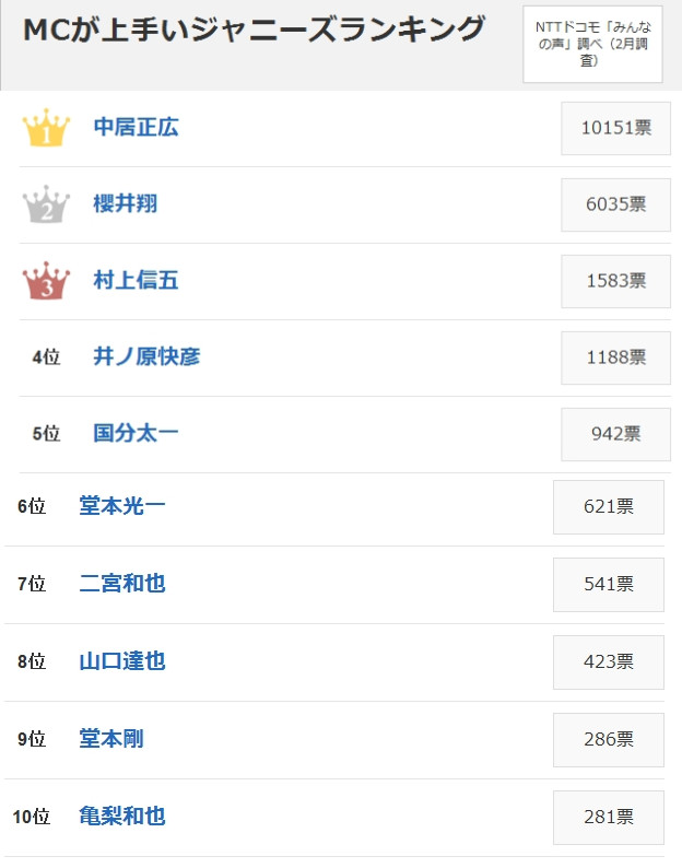 日本媒體于2月13日至20日就此進行調查,共收到23397張投票,如今結果已經公布。有趣的是,在今年的榜單中排名第一的中居正廣和排名第二的櫻井翔,在去年同樣的榜單中位次正好相反,不過也都是遙遙領先其他藝人?梢,在杰尼斯藝人群體中,兩人的主持功力都非常得到粉絲的認可。