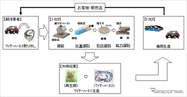 近日,日本豐田汽車公司聯手矢崎總業、豐田通用以及與豐田通商有業務往來的8家中部地區汽車解體廠,在全球首次開發出了可以對廢舊線束中的銅進行重新利用的“Car to Car回收技術”。
