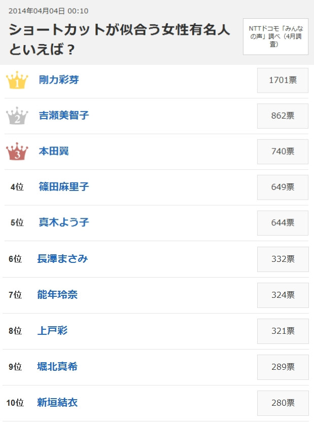 根據投票,剛力彩芽以較大優勢排名第一。而已經于去年成為媽媽的人氣御姐吉瀨美智子排在第二位。日本女性時尚模特、演員本田翼也進入三甲。具體榜單如下。