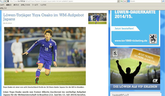 慕尼黑1860在官網上公布大迫勇也入選世界杯日本隊(朝日新聞)