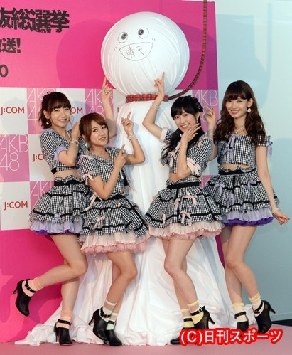 日本偶像組合AKB48成員渡邊麻友、高橋南、小嶋陽菜和柏木由紀8日參加了名為“AKB48 第37張單曲選拔總選舉 APPEAL COMMENT 用‘J:COM電視’更早播出”的記者發布會。